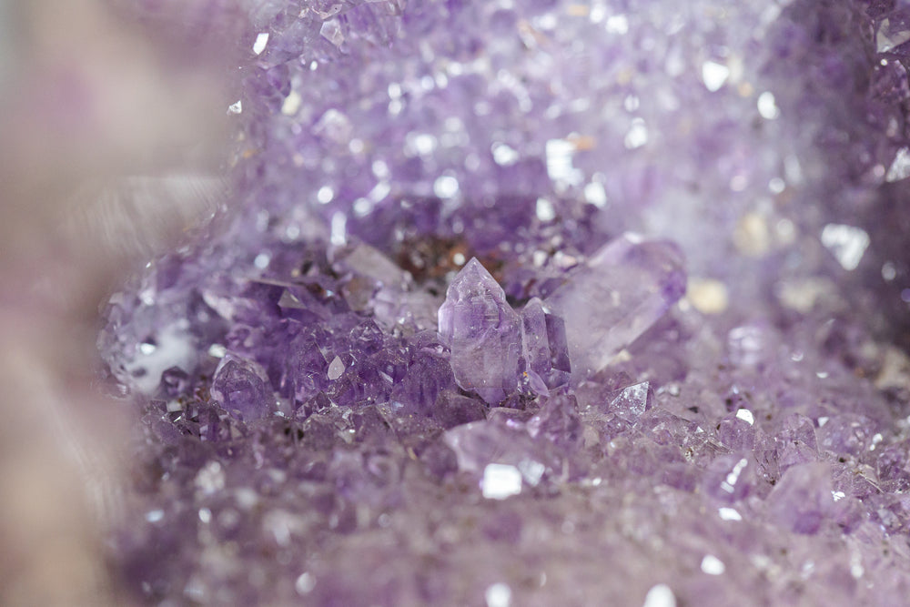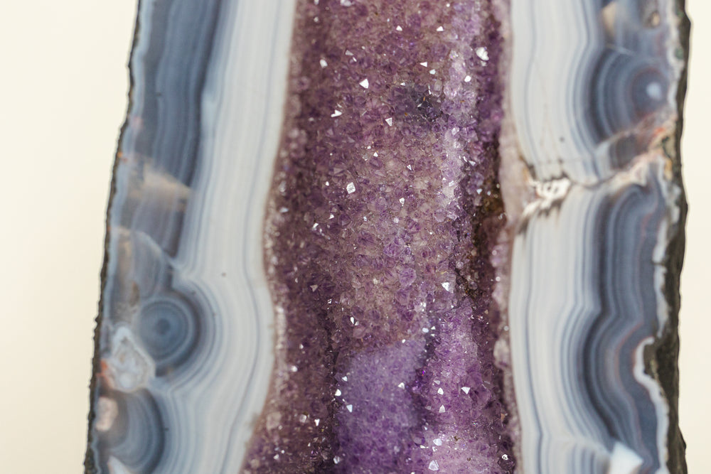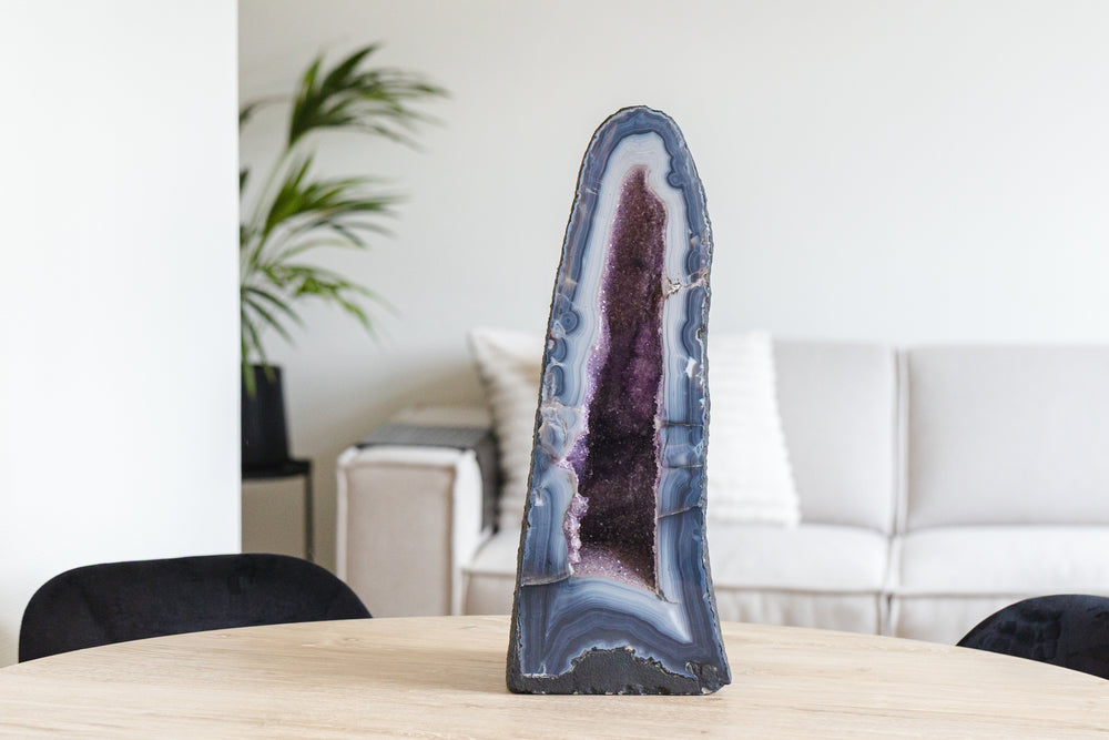 Deze schitterende amethist geode is een ware schat van de natuur. De binnenzijde is rijk gevuld met diep paarse kristallen die fonkelen in het licht en een kalmerende, beschermende energie uitstralen. Wat dit stuk extra bijzonder maakt, is de prachtige agaat rand – met haar natuurlijke lagen en aardse tinten – die het geheel een elegante, afgeronde uitstraling geeft.
