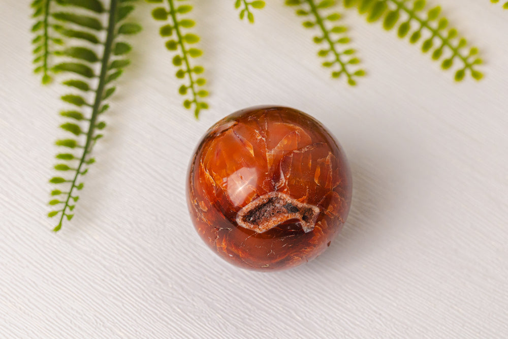 Bijzonderheid: De bolvorm verspreidt de energie gelijkmatig, waardoor de vitaliserende kracht van carneool je ruimte zacht maar krachtig vult.