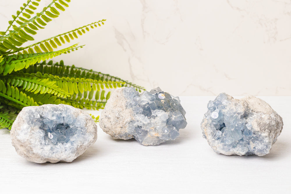 Deze ruwe stukken celestien hebben schitterende kristalclusters die fonkelen in het licht. Elk stuk is uniek – een natuurlijk kunstwerk van zachtheid en schoonheid.
