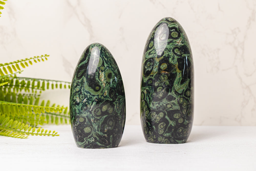 Laat je meevoeren naar de rust van de natuur met onze Kambaba Jaspis sculpturen – mystieke stenen met een diepgroen, bijna aards uiterlijk en kenmerkende zwarte, cirkelvormige patronen. Deze bijzondere jaspissoort wordt vaak geassocieerd met oeroude energie en diepe aardeverbinding.