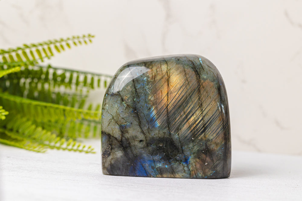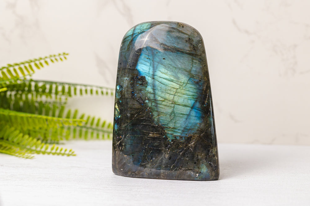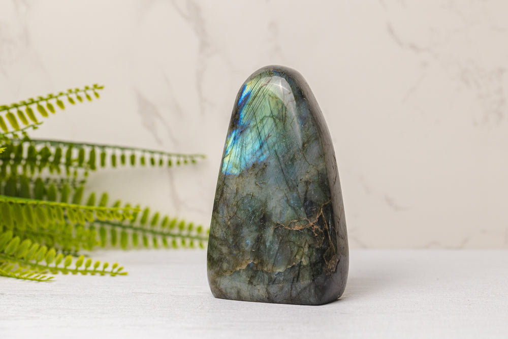 Voeg een vleugje mystiek toe aan je ruimte met onze Labradoriet sculpturen – krachtige beschermstenen die bekend staan om hun magische kleurenspel. Elke sculptuur is een uniek kunstwerk, met iriserende flitsen in blauw, groen, goud of paars die oplichten wanneer het licht erop valt.