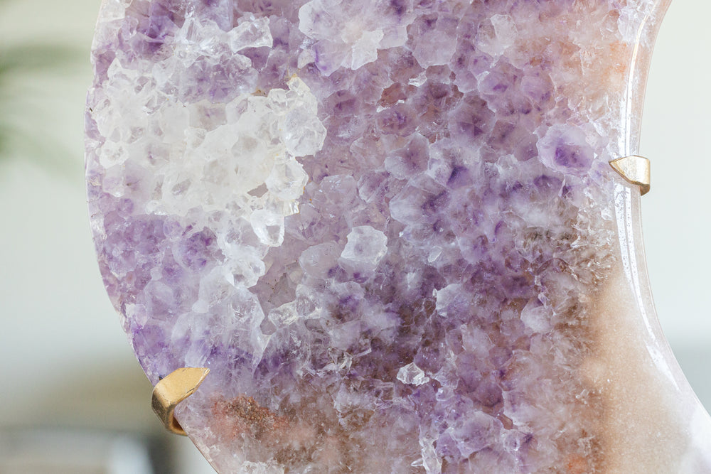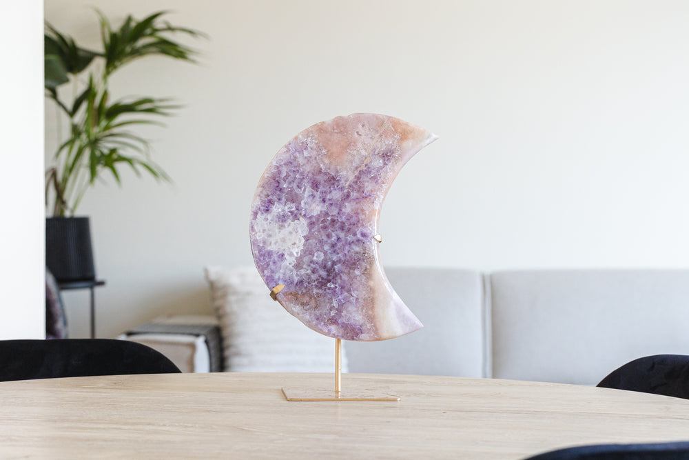 Roze amethist straalt een zachte, liefdevolle energie uit en ondersteunt emotionele heling, zelfliefde en innerlijke rust. De maanvorm staat symbool voor intuïtie, transformatie en vrouwelijke kracht. Samen vormen ze een krachtig energetisch decorstuk dat rust brengt én inspireert.