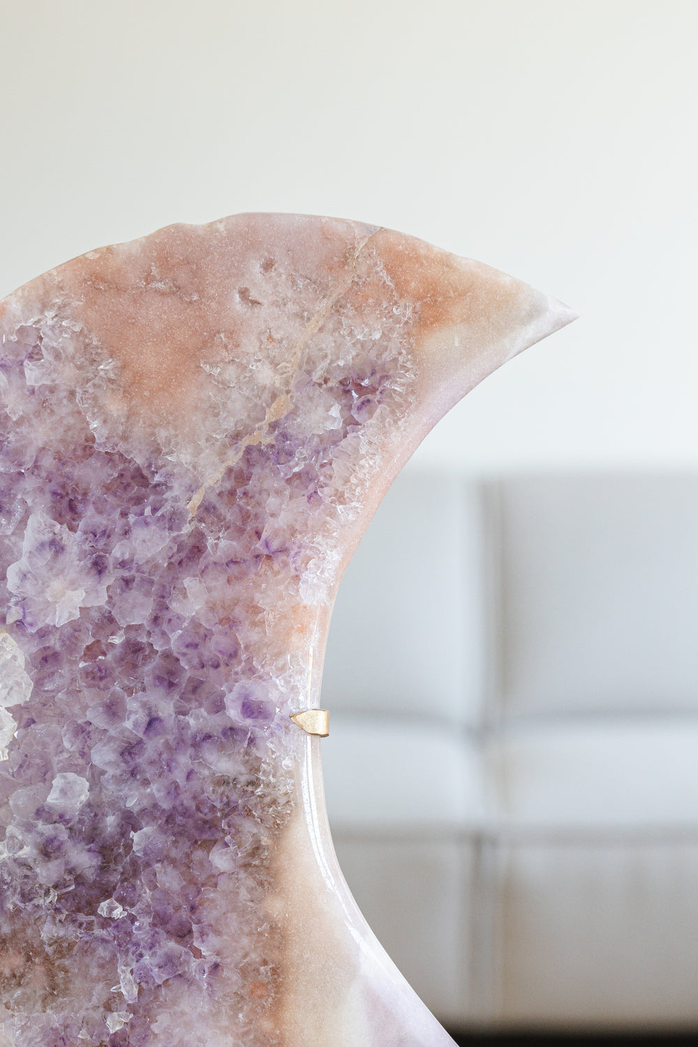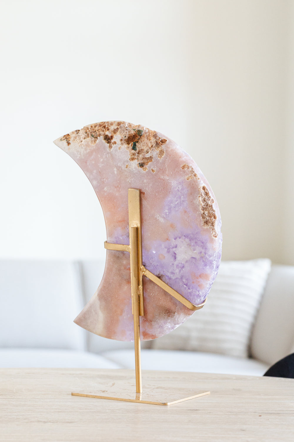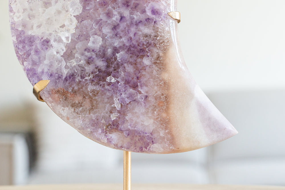 Deze betoverende roze amethist maan op een elegante gouden standaard combineert zachtheid, mystiek en stijl in één uniek stuk. De maanvorm versterkt de intuïtieve en vrouwelijke energie van roze amethist, terwijl de goudkleurige standaard zorgt voor een luxe, moderne uitstraling.