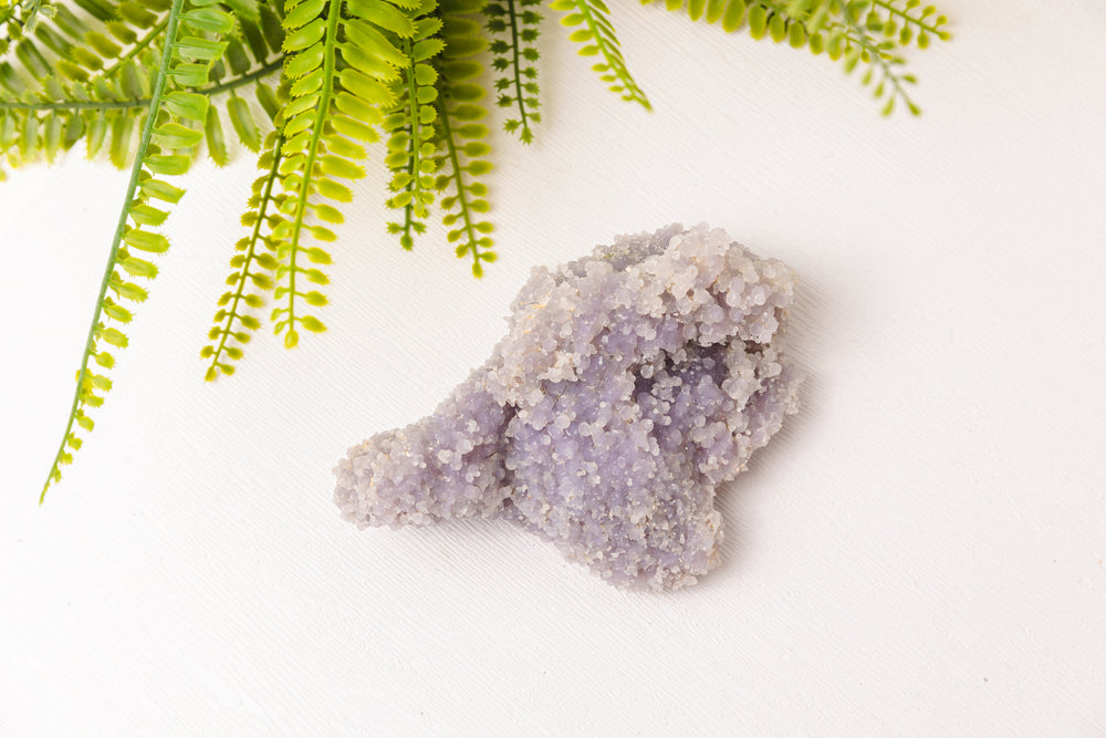 Dit ruwe stuk druifagaat is een waar natuurwonder. De steen dankt zijn naam aan de bijzondere, ronde bolletjes die lijken op trossen druiven. Deze unieke structuur en zachte paarse tot lavendelkleur maken druifagaat geliefd bij verzamelaars én liefhebbers van bijzondere edelstenen.