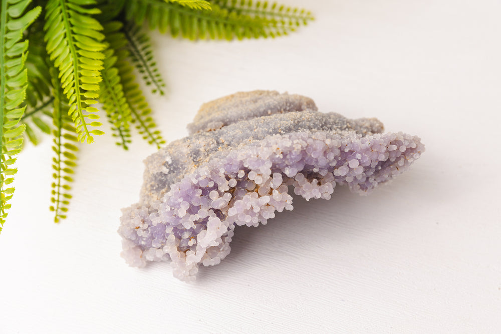 Dit ruwe stuk druifagaat is een waar natuurwonder. De steen dankt zijn naam aan de bijzondere, ronde bolletjes die lijken op trossen druiven. Deze unieke structuur en zachte paarse tot lavendelkleur maken druifagaat geliefd bij verzamelaars én liefhebbers van bijzondere edelstenen.