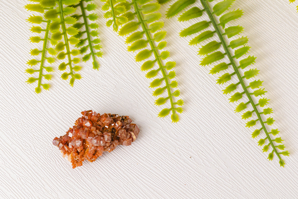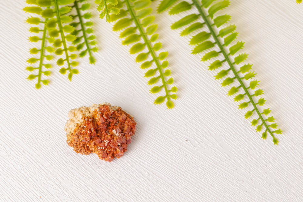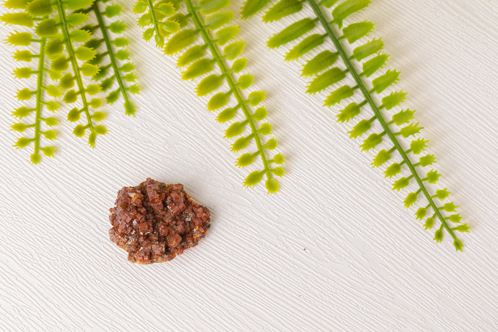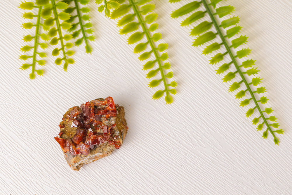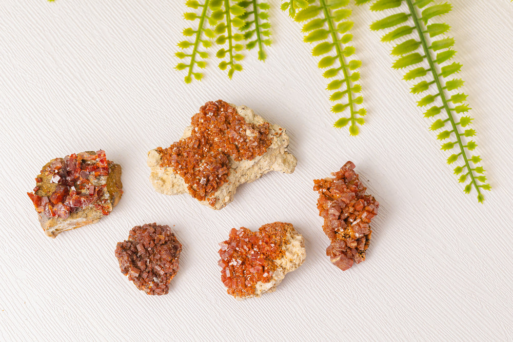 Laat je betoveren door de diepe roodbruine kristallen van Vanadiniet – een zeldzame en krachtige mineraalsoort die direct in het oog springt. Deze ruwe stukken zijn natuurlijk gevormd en bevatten schitterende, zeshoekige kristalletjes die fonkelen in het licht.