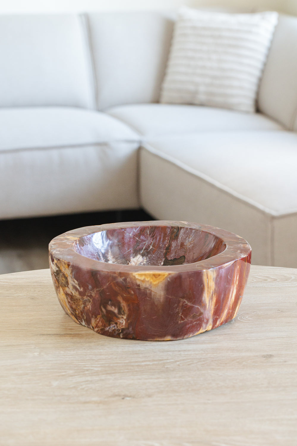 Versteend hout staat voor stabiliteit, bescherming en innerlijke rust. De rode kleur voegt daar een extra dimensie van levenskracht en vitaliteit aan toe. Deze schaal is niet alleen een prachtig decoratief object, maar draagt ook bij aan een warme, geaarde sfeer in je ruimte.