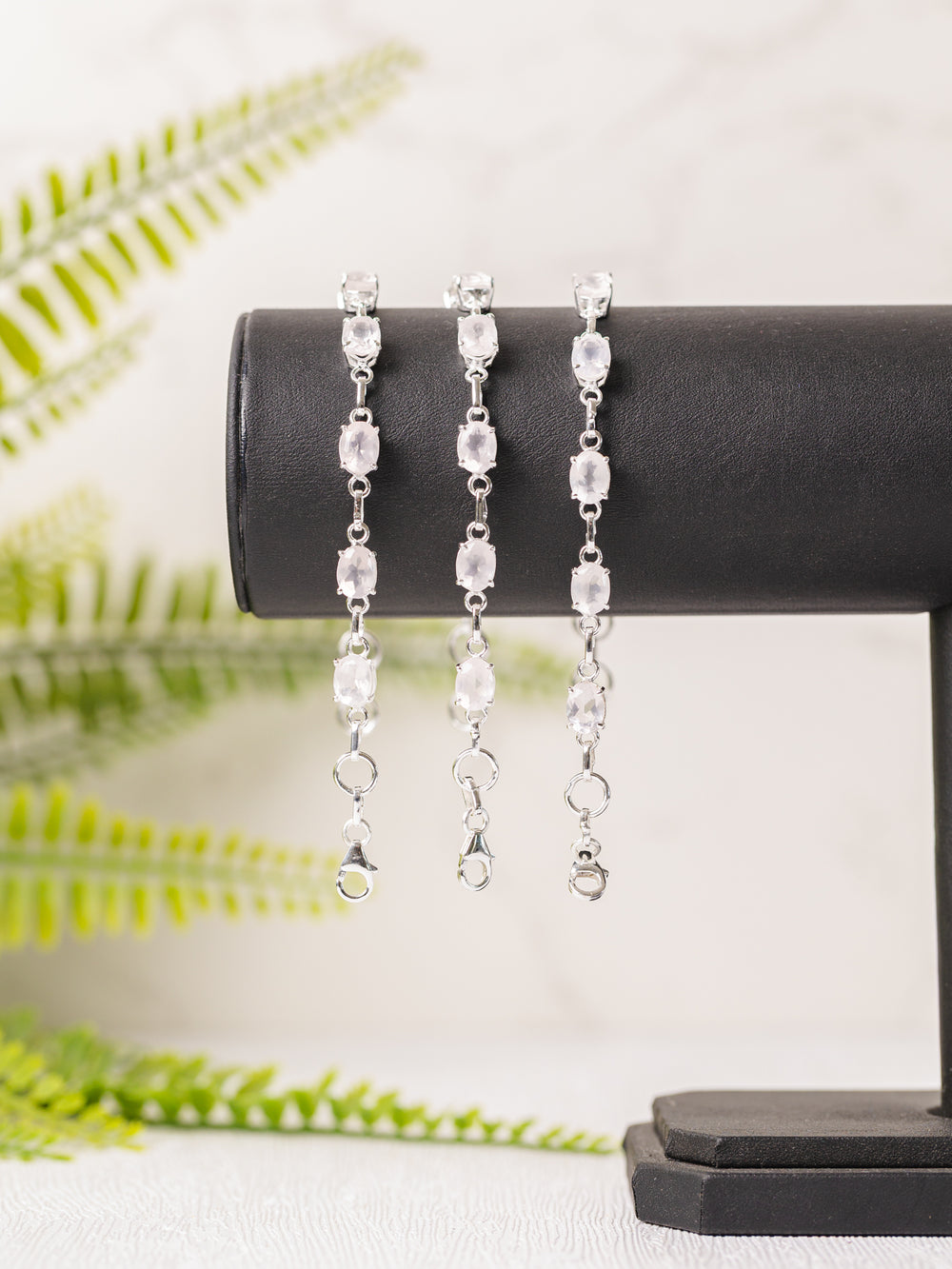 Deze verfijnde zilveren armband met ovaal geslepen, gefacetteerde rozenkwartsstenen straalt zachtheid, liefde en elegantie uit. De facetgeslepen afwerking laat de steen subtiel fonkelen bij elke beweging, terwijl de 925 sterling zilveren zetting zorgt voor een stijlvolle en tijdloze uitstraling.