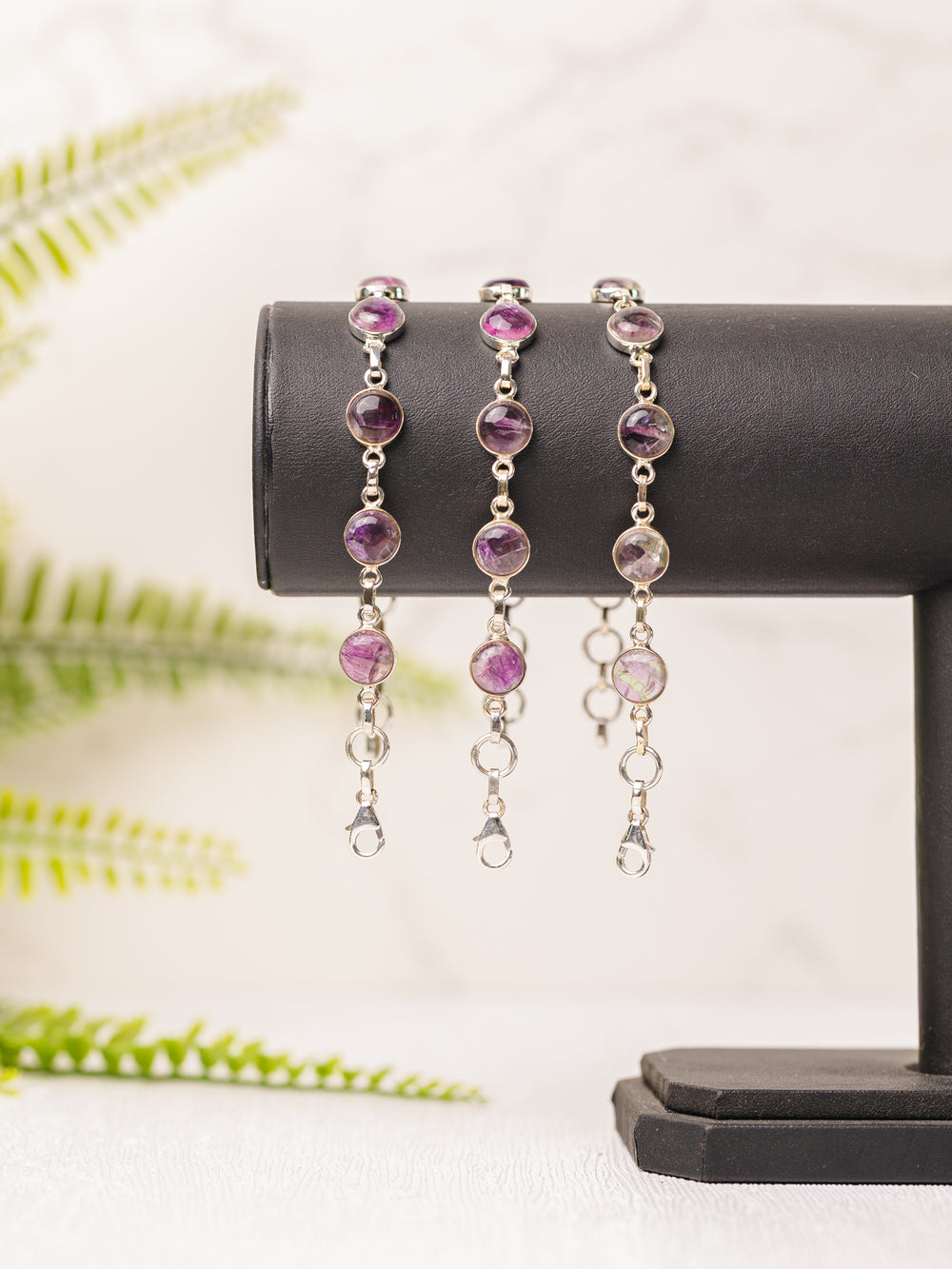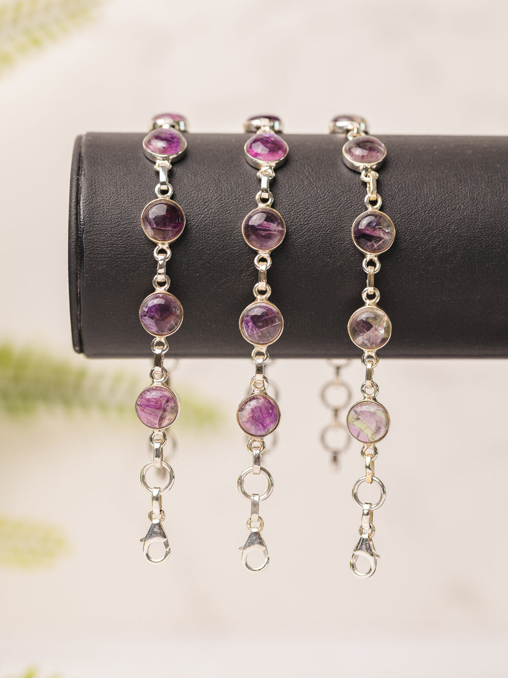 Deze prachtige zilveren armband met ronde fluorietstenen straalt rust, helderheid en balans uit. De transparante tot paarsgroene tinten van fluoriet creëren een betoverend kleurenspel, perfect geaccentueerd door de 925 sterling zilveren zetting.