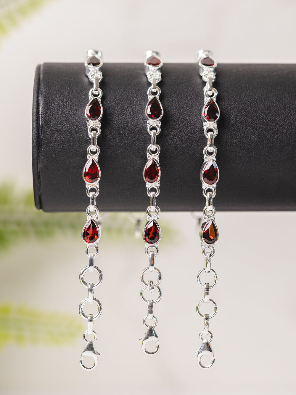 Deze stijlvolle zilveren armband met druppelvormige granaatstenen straalt passie, kracht en elegantie uit. De diepe wijnrode kleur van de granaat komt prachtig tot zijn recht in de 925 sterling zilveren zetting, die de natuurlijke glans van de steen versterkt.