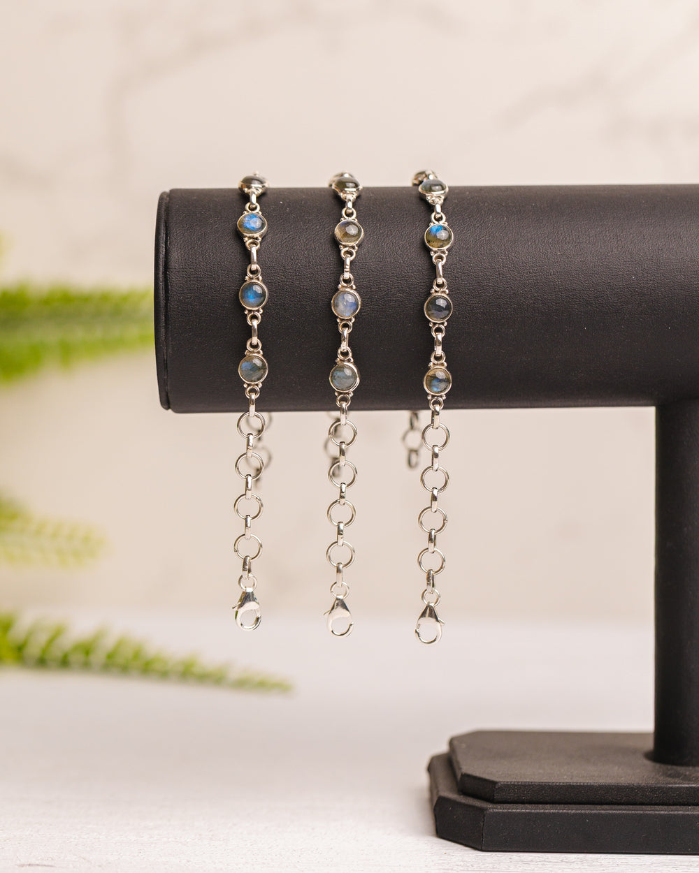 Laat je betoveren door de mysterieuze glans van labradoriet. Deze zilveren armband is afgewerkt met een ronde labradoriet steen, die bij elke beweging een uniek kleurenspel van blauw, groen en goud laat zien. Een stijlvol en krachtig sieraad dat direct de aandacht trekt.