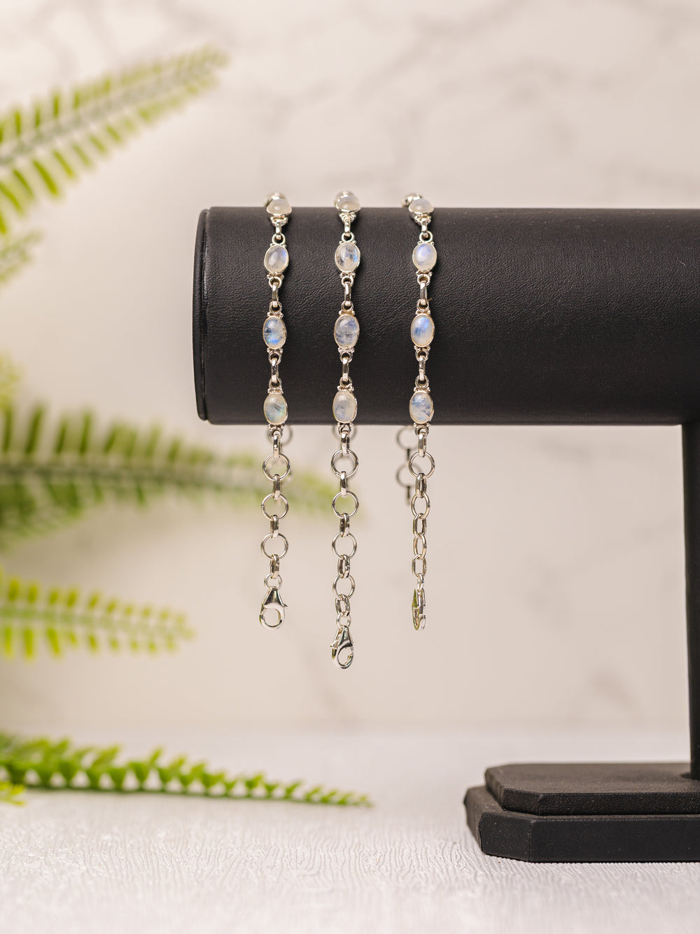 Deze verfijnde zilveren armband met kleine ovale regenboog maanstenen straalt elegantie en zachte, vrouwelijke energie uit. De 925 sterling zilveren zetting accentueert de iriserende glans van de stenen, die in het licht betoverende blauwe en paarse tinten laten zien.