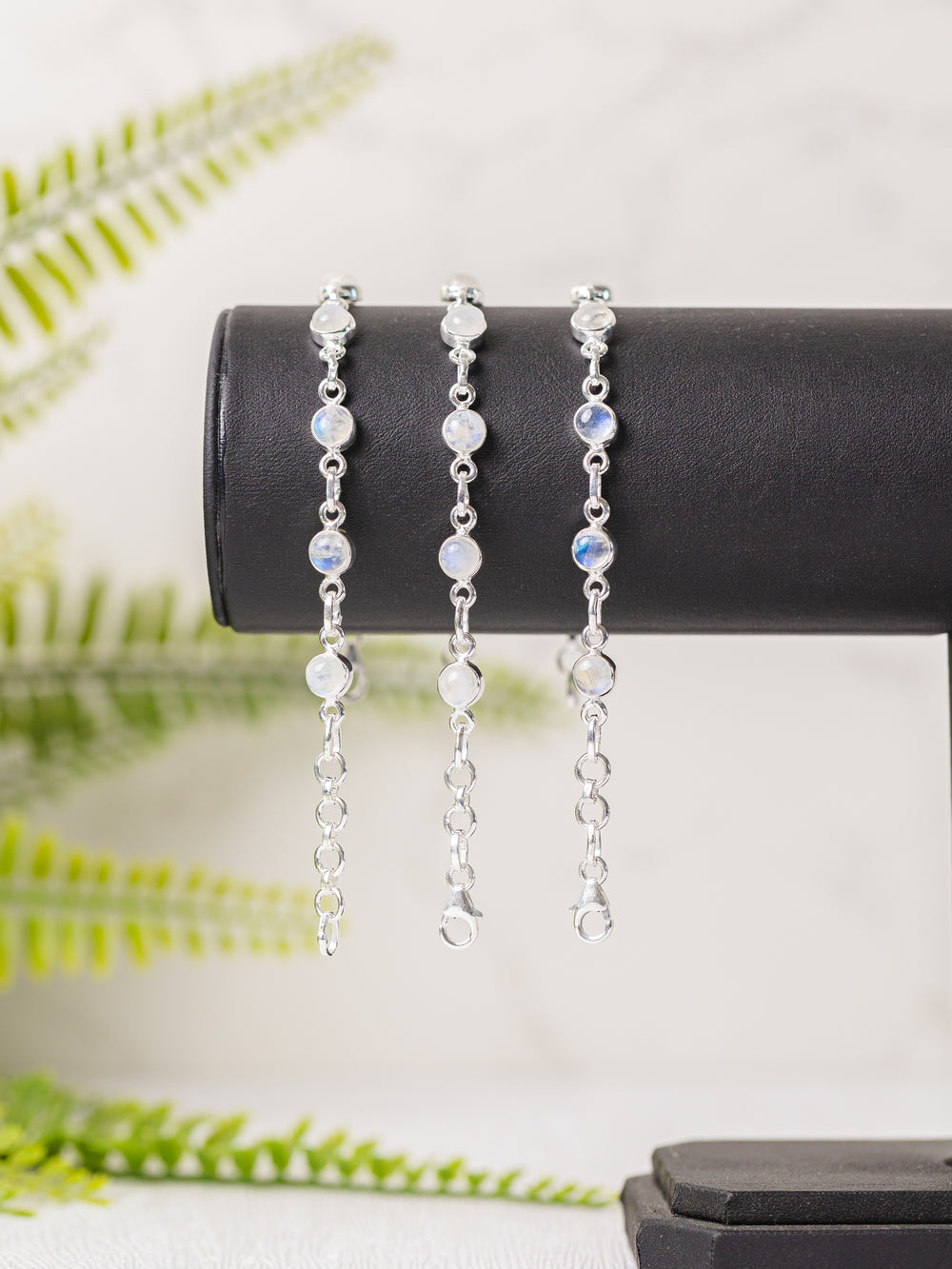 Deze betoverende zilveren armband met ronde regenboog maanstenen straalt mystiek, zachtheid en vrouwelijke energie uit. De 925 sterling zilveren zetting omlijst de prachtige stenen die in het licht schitteren met een iriserende ‘flash’ in blauw, paars of goud, elke armband is uniek in kleurenspel en uitstraling.
