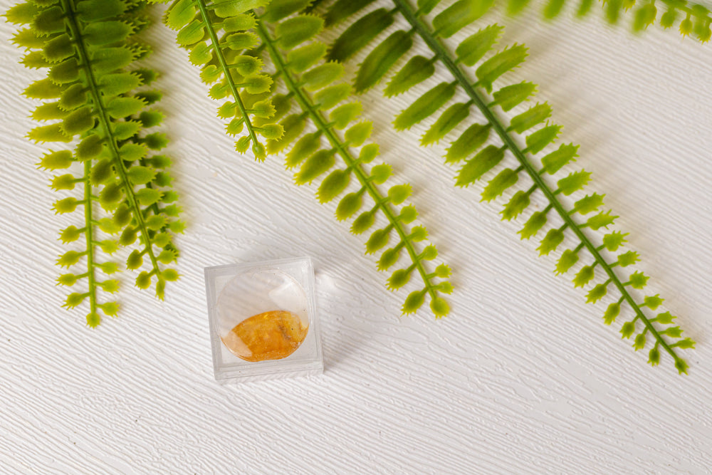 Dit fascinerende stukje Barnsteen met ingesloten insect is een waar natuurhistorisch kunstwerk. Barnsteen is versteende boomhars die miljoenen jaren oud is, en dit exemplaar bevat een zeldzame insluiting: een insect dat perfect bewaard is gebleven in de hars.