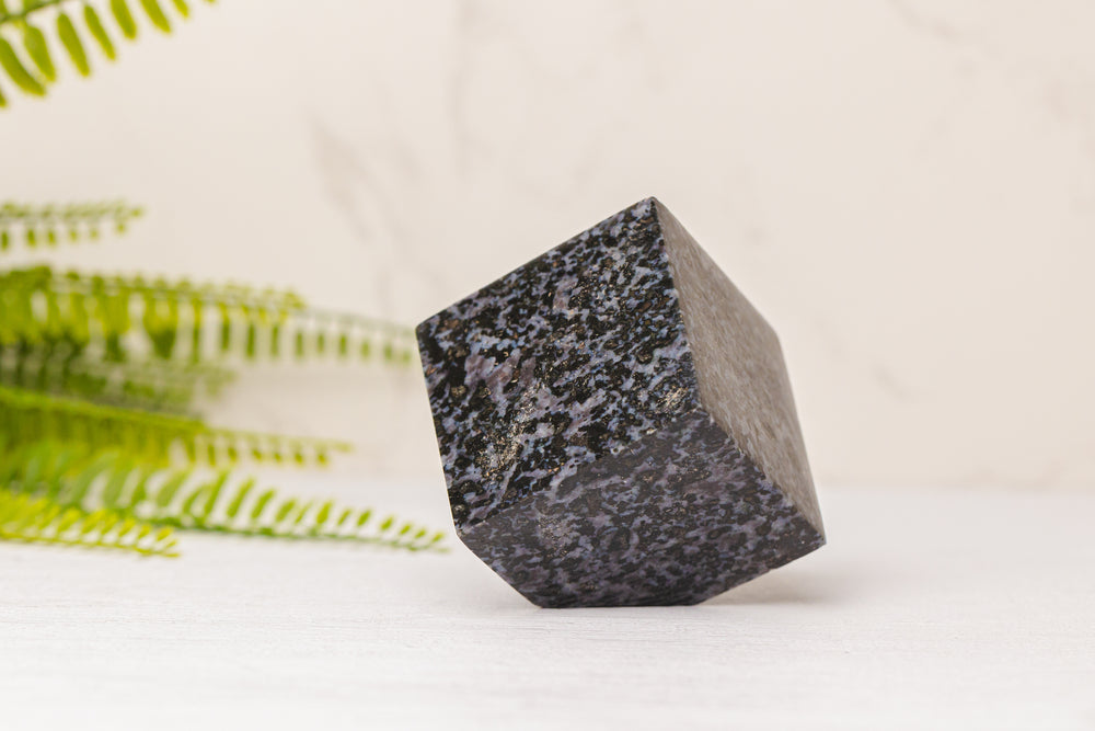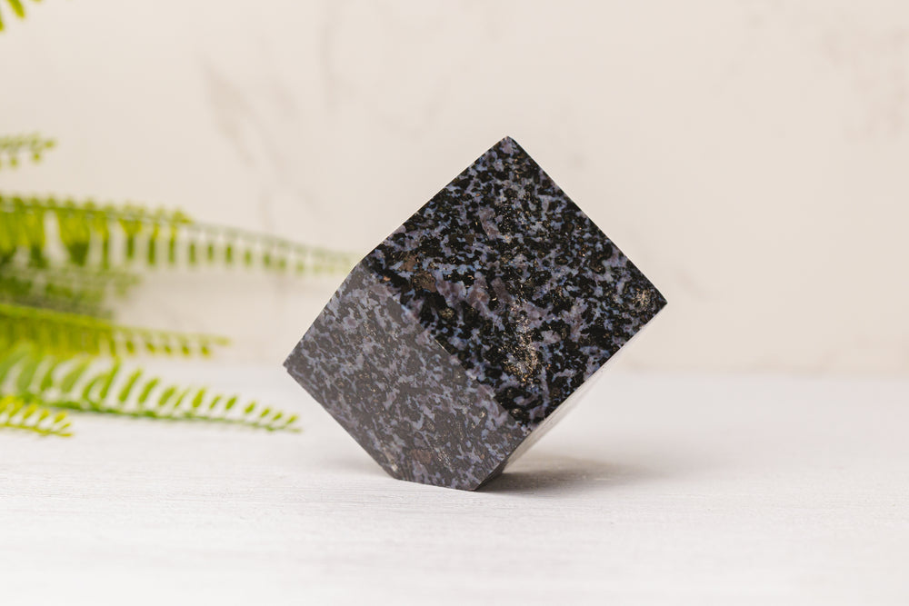 Deze bijzondere Gabro kubus, ook wel Merliniet genoemd, is een mystieke en krachtige steen met een diepzwarte basis en grijze tot paarsachtige insluitsels. De glad gepolijste kubusvorm versterkt de aardende en stabiele energie van de steen, terwijl de natuurlijke tekeningen zorgen voor een uniek en intrigerend uiterlijk.