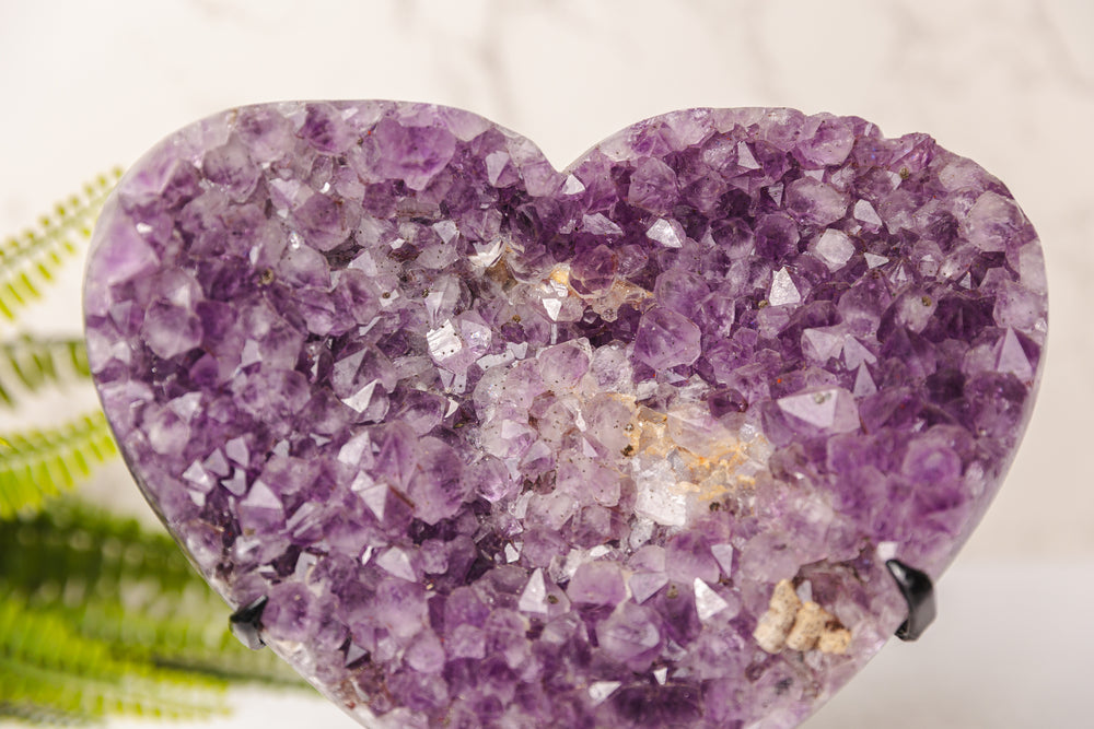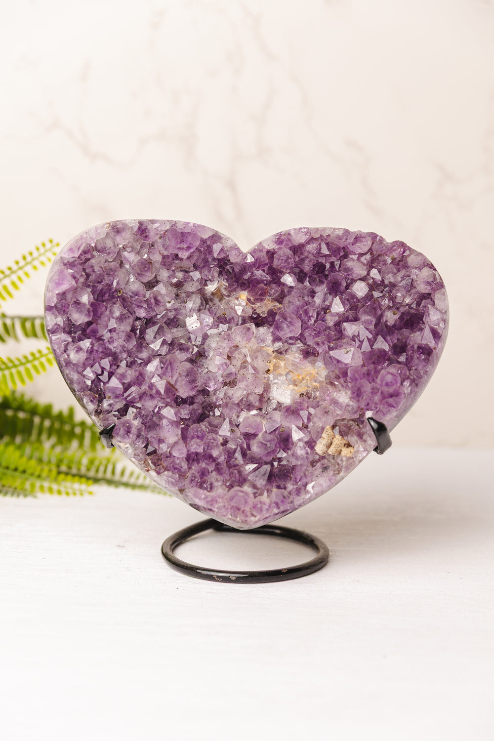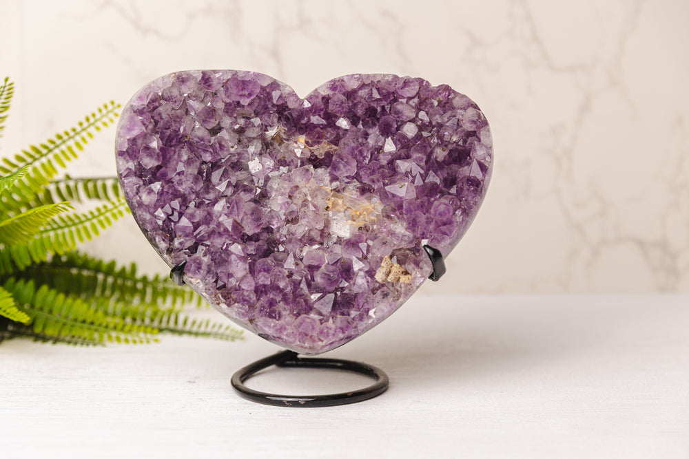 Het hart staat stevig op een zwarte metalen standaard, waardoor het direct klaar is om neer te zetten als blikvanger in je woonkamer, werkplek of meditatiehoek. Elk exemplaar is volledig uniek in kleur, vorm en kristalpatroon – een echt geschenk van de natuur.