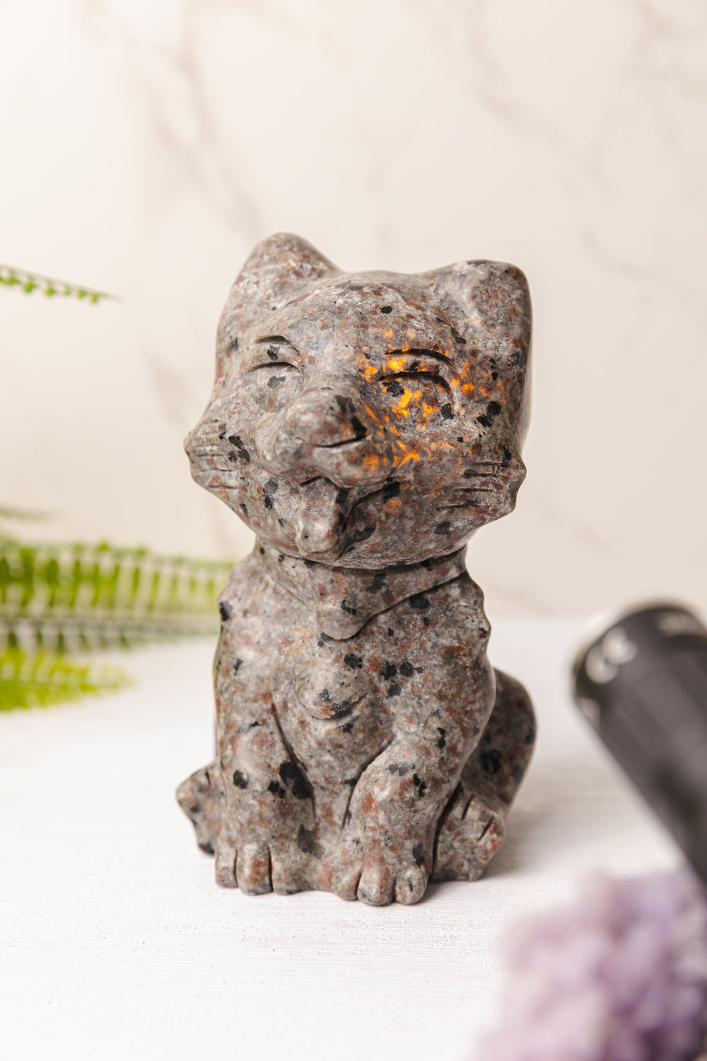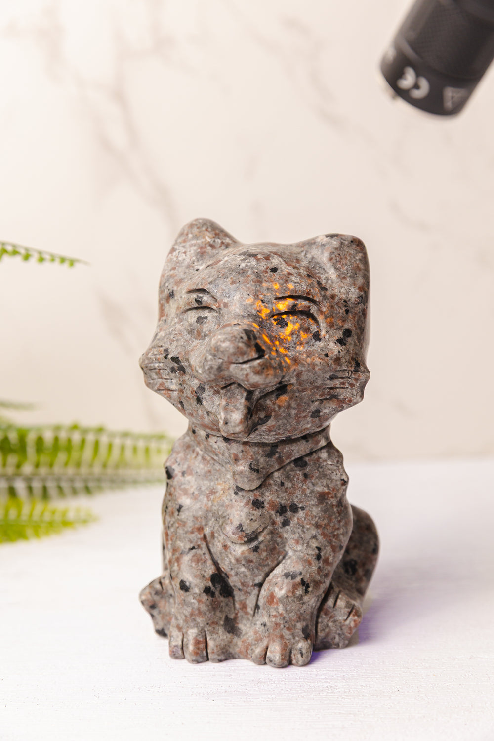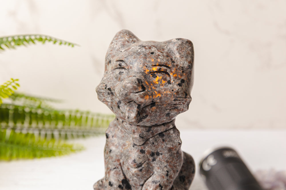 Dit bijzondere beeldje is handgemaakt uit yooperliet, een zeldzame steen die bekendstaat om zijn verrassende fluorescentie. Onder normaal licht heeft de steen een intrigerend grijs tot zwart gespikkeld patroon, maar zodra er UV-licht op schijnt, komt er een magische transformatie tevoorschijn: heldere oranje reflecties lichten op als vurige vonken in het donker.