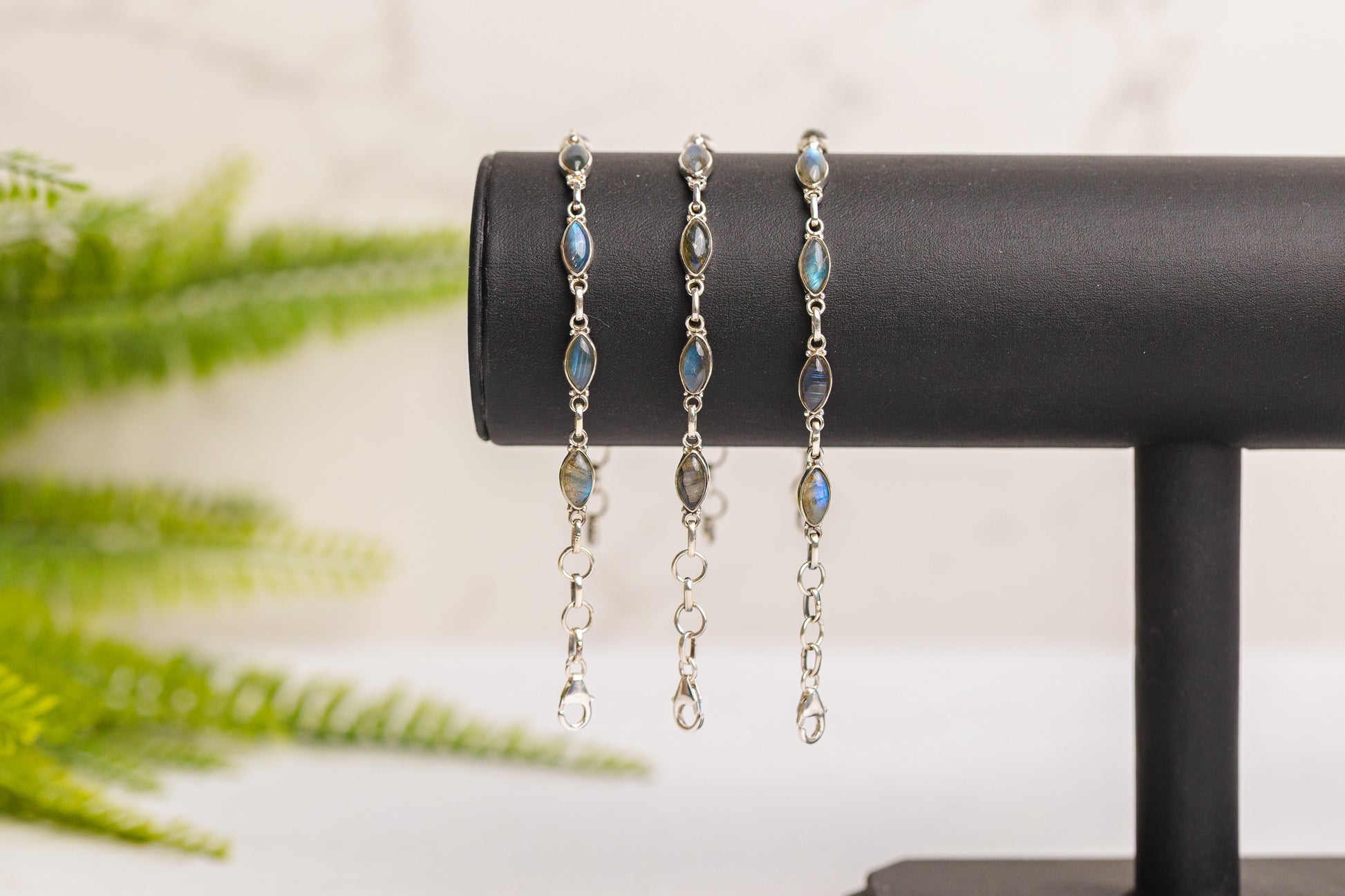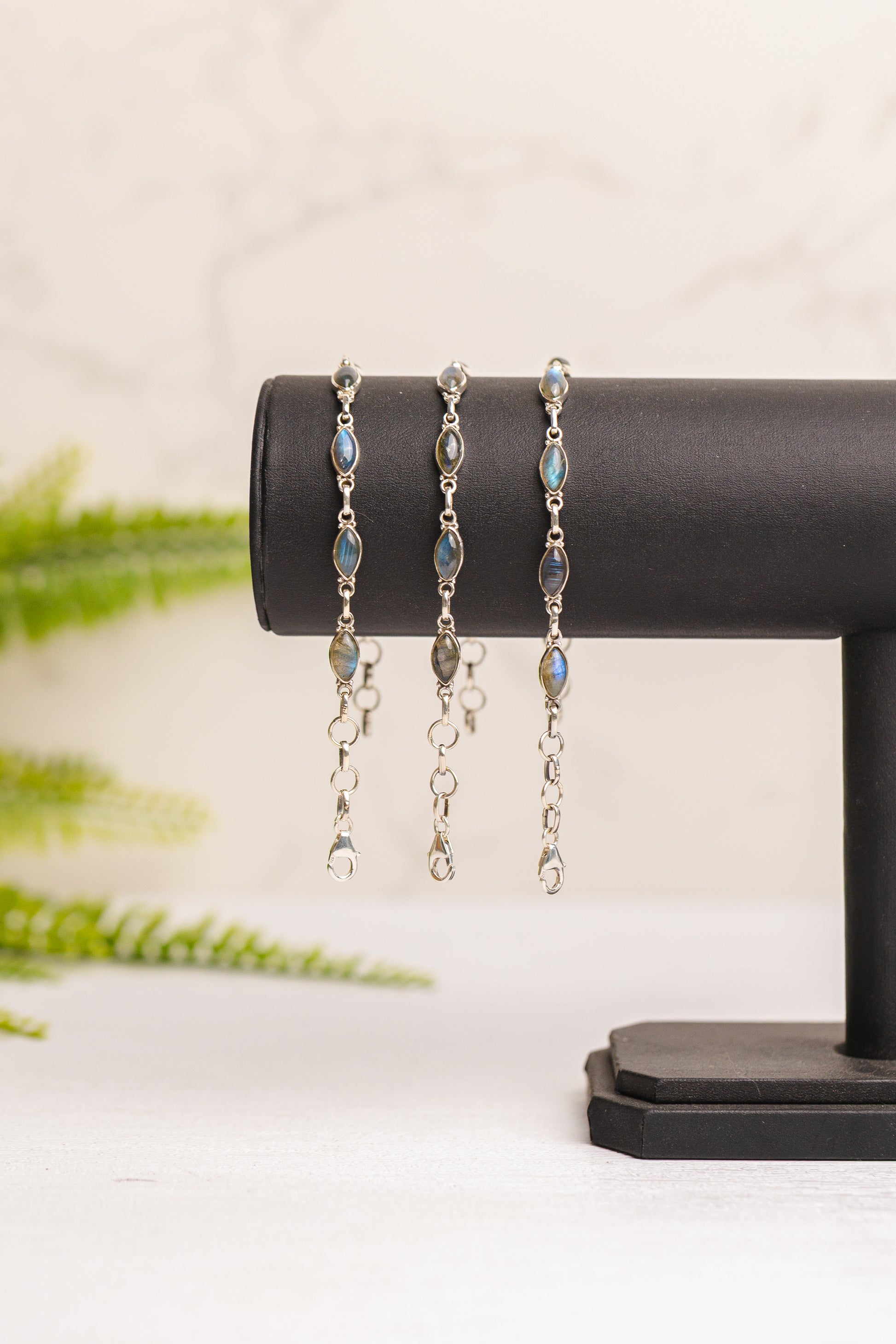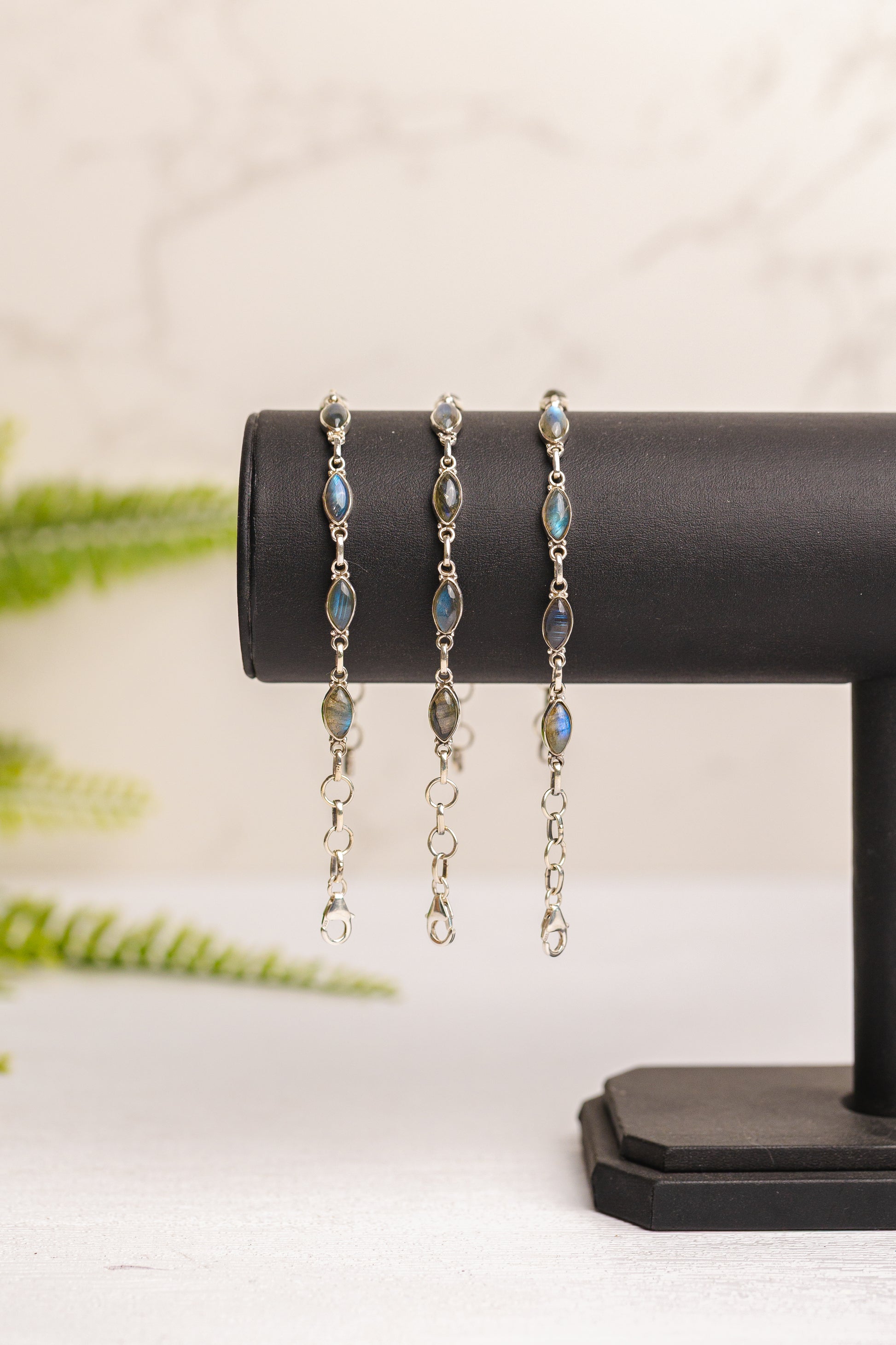 Ontdek de mysterieuze schoonheid van labradoriet. Deze elegante zilveren armbanden zijn gezet met een ovaal geslepen labradoriet steen, die betovert met een uniek kleurenspel van blauw, groen en goud zodra het licht erop valt.