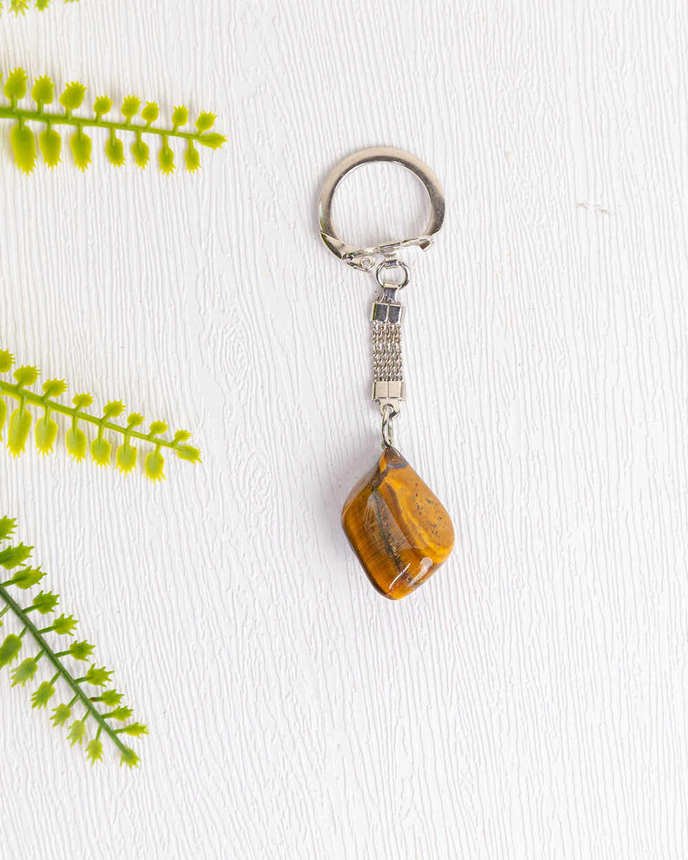Een mooie zilverkleurige sleutelhanger met tijgeroog steen, herkenbaar aan de warme bruin-gouden kleuren en het karakteristieke zijdeachtige effect. Een stijlvol accessoire voor je sleutels, tas of portemonnee.